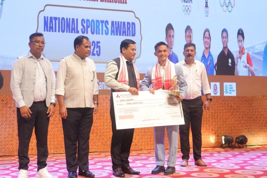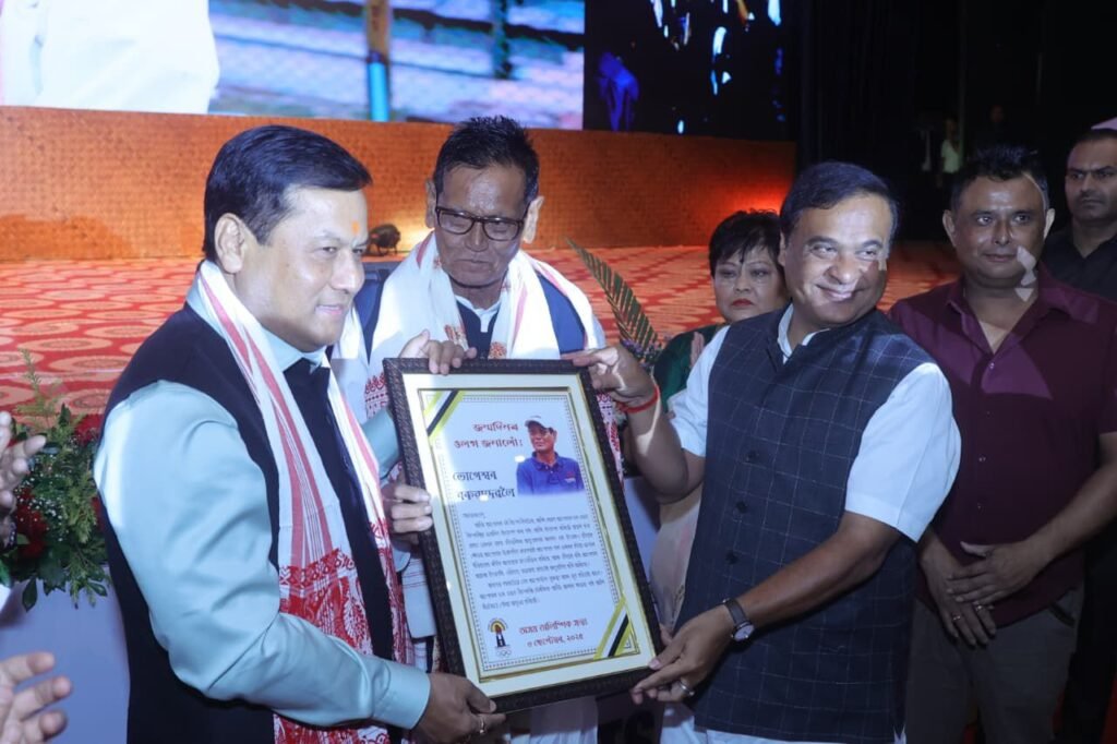 মুখ্যমন্ত্ৰী ড° হিমন্ত বিশ্ব শৰ্মা, কেন্দ্ৰীয় মন্ত্ৰী সৰ্বানন্দ সোণোৱালে ভাৰতৰ যশস্বী ক্ৰীড়াবিদসকলক ভোগেশ্বৰ বৰুৱা ৰাষ্ট্ৰীয় ক্ৰীড়া বঁটা বঁটা প্ৰদান কৰে