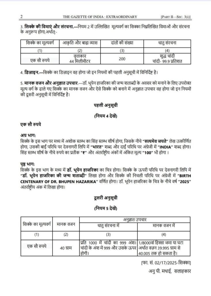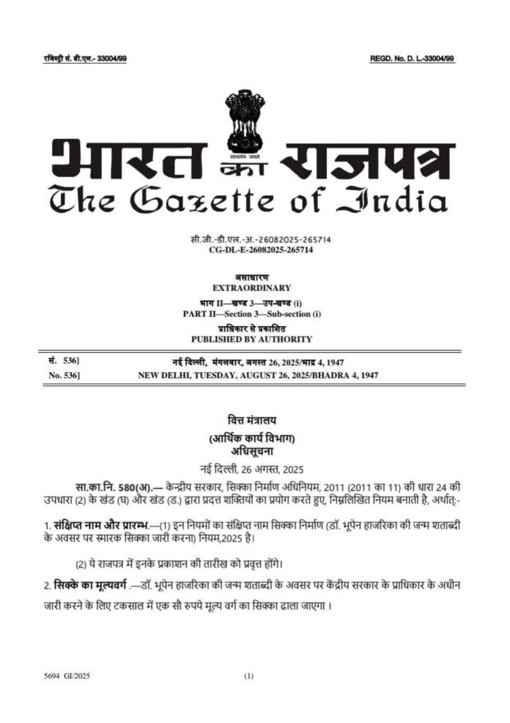 ভাৰত চৰকাৰৰ বিত্ত মন্ত্ৰণালয়ৰ তৰফৰ পৰা ২০২৫ চনৰ ২৭ আগষ্টত ডঃ ভূপেন হাজৰিকাৰ জন্ম শতবৰ্ষৰ স্মৃতিত এশ টকাৰ মূল্যৰ এটি স্মৃতি মুদ্ৰা জাৰি কৰাৰ বাবে গেজেট অধিসূচনা প্ৰকাশ কৰা হৈছে। এই মুদ্ৰাৰ মূল্য নিৰ্ধাৰণৰ জৰিয়তে তেওঁৰ অৱদানৰ গুৰুত্ব আৰু তেওঁৰ সৃষ্টিৰ স্থায়ী প্ৰভাৱক প্ৰতিফলিত কৰাৰ লগতে অসমৰ সাংস্কৃতিক ঐতিহ্যৰ প্ৰতি ভাৰত চৰকাৰৰ গভীৰ সন্মানৰ প্ৰকাশ। ডঃ হাজৰিকাৰ গীতসমূহে অসমীয়া জনজীৱনৰ বিভিন্ন দিশ, যেনে সামাজিক অসমতা, প্ৰকৃতিৰ সৌন্দৰ্য, আৰু মানৱতাৰ বাৰ্তাৰ প্ৰতিফলন ঘটাইছিল। তেওঁৰ সৃষ্টিসমূহ কেৱল গীত বা সুৰৰ মধ্যে সীমাবদ্ধ নাছিল, বৰঞ্চ সমাজৰ প্ৰতি তেওঁৰ গভীৰ চিন্তা-চৰ্চাৰ প্ৰকাশ আছিল। এই মুদ্ৰাৰ জৰিয়তে তেওঁৰ এই অৱদানসমূহ জাতীয় পৰ্যায়ত পুনৰ স্মৰণ কৰা হৈছে, আৰু অসমৰ সাংস্কৃতিক পৰিচয়ক বিশ্বৰ সন্মুখত উপস্থাপনৰ এক নতুন সুযোগ সৃষ্টি হৈছে। এই সিদ্ধান্তই এই কথাও প্ৰতিফলিত কৰে যে ভাৰত চৰকাৰে অঞ্চলীয় সংস্কৃতিৰ প্ৰতি সন্মান জনোৱাৰ ক্ষেত্ৰত সচেতন পদক্ষেপ গ্ৰহণ কৰিছে। এই পদক্ষেপে অসমীয়া জনগণৰ মাজত গৌৰৱ আৰু আত্মপৰিচয়ৰ চেতনা জাগ্ৰত কৰিছে, যিয়ে তেওঁলোকৰ সাংস্কৃতিক ঐতিহ্যৰ গুৰুত্বক জাতীয় পৰ্যায়ত পুনৰ স্থাপন কৰিছে। এই মুদ্ৰাৰ প্ৰকাশনাৰ জৰিয়তে অসমৰ সাংস্কৃতিক ঐতিহ্যৰ গৌৰৱময় দিশসমূহ বিশ্বৰ দৰবাৰত পুনৰ উপস্থাপনৰ সুযোগ সৃষ্টি হৈছে, যিয়ে অসমীয়া জনগণৰ মনত এক নতুন উদ্দীপনাৰ সঞ্চাৰ কৰিব।