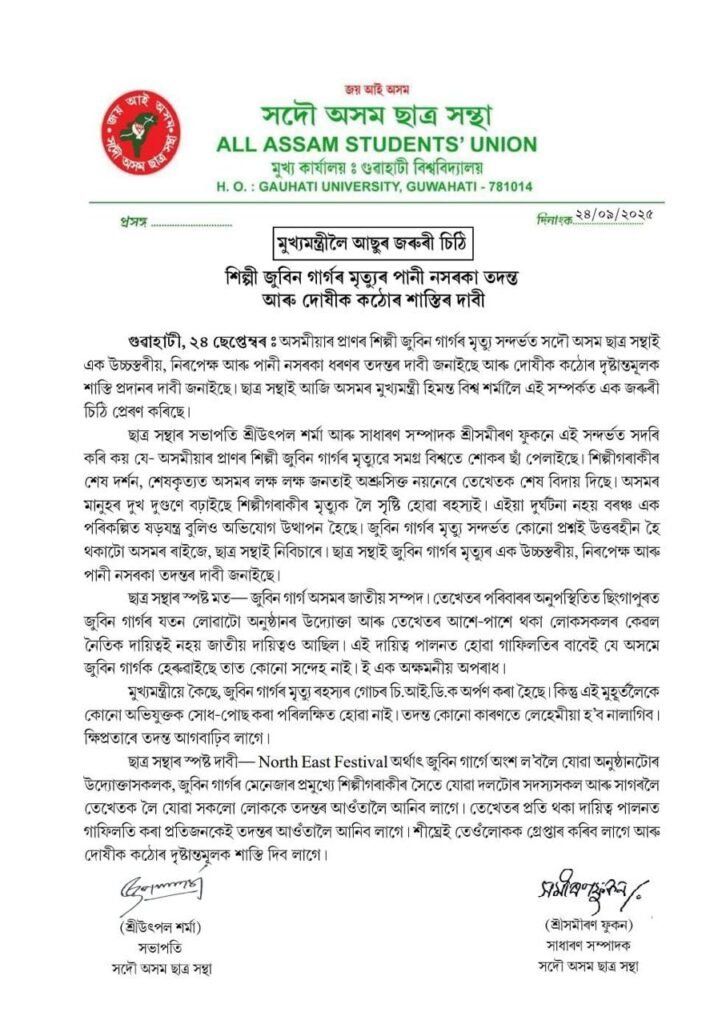 ASSU: শিল্পী জুবিন গাৰ্গৰ মৃত্যুৰ পানী নসৰকা তদন্ত আৰু দোষীক কঠোৰ শাস্তিৰ দাবী জনাই মুখ্যমন্ত্ৰীলৈ আছুৰ জৰুৰী পত্ৰ
