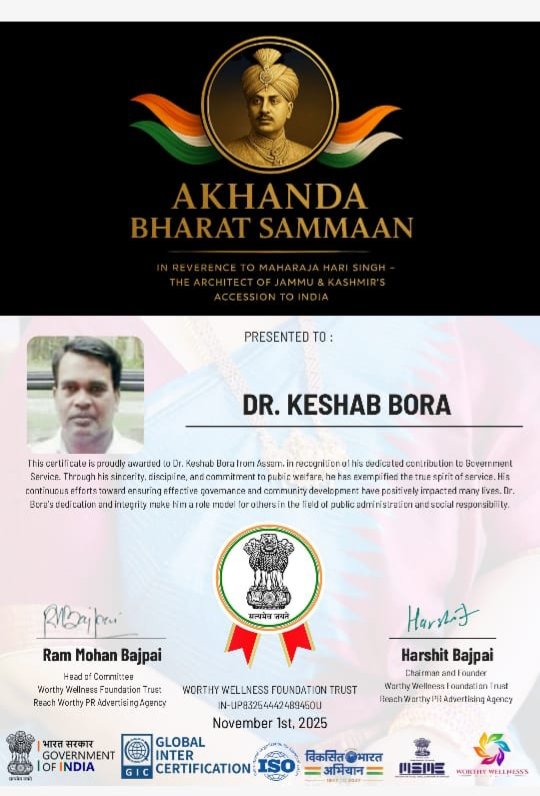 ইয়াৰ উপৰি একেটা ট্ৰাষ্টৰ অধ্যক্ষ তথা প্ৰতিষ্ঠাপক হৰ্ষিত বাজপাই স্বাক্ষৰিত অখণ্ড ভাৰত সন্মানো তেওঁ লাভ কৰে।