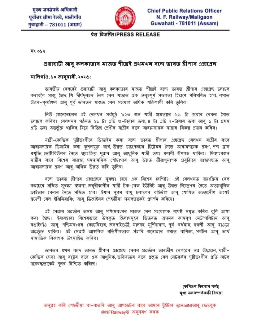 ভাৰতীয় ৰেলৱেই গুৱাহাটী আৰু কলকাতাৰ মাজত শীঘ্ৰেই বন্দে ভাৰত শ্লীপাৰ এক্সপ্ৰেছ চলাচল কৰাবলৈ সাজু হৈছে, যি দীৰ্ঘদূৰত্বৰ নৈশ ৰেল যাত্ৰাত এক গুৰুত্বপূৰ্ণ সফলতা হিচাপে পৰিগণিত হ’ব, লগতে উত্তৰ-পূৰ্ব্বাঞ্চল আৰু পূৰ্ব ভাৰতৰ মাজত ৰেল সংযোগ অধিক শক্তিশালী কৰি তুলিব।