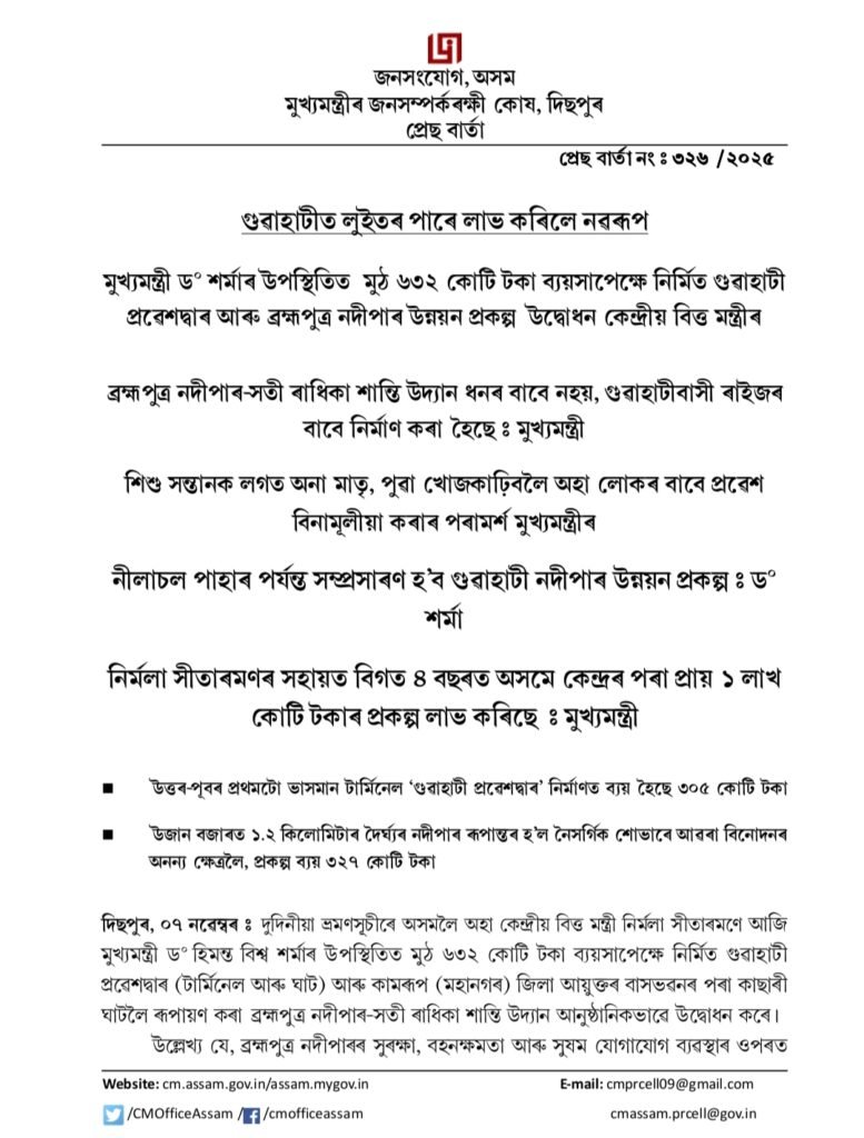 DD TIMES Dispur, November 7: Union Minister of Finance and Corporate Affairs Nirmala Sitharaman today inaugurated the Gateway of Guwahati (Terminal and Jetty) and the Brahmaputra Riverfront Development Project – Sati Radhika Shanti Udyan, developed from the new Kamrup (Metro) DC Office to Kachari Ghat, in the presence of Chief Minister Dr. Himanta Biswa Sarma.