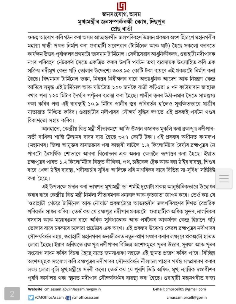 Speaking on the occasion, Chief Minister Dr. Sarma thanked Union Finance Minister Nirmala Sitharaman for her support and said that the Gateway of Guwahati will bring about a revolutionary change in inland water transport in Assam.