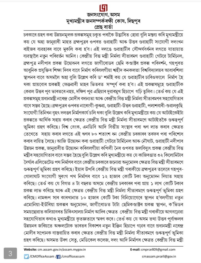 Dr. Sarma appreciated the continuous support of Prime Minister Narendra Modi and Finance Minister Nirmala Sitharaman in making these projects possible.