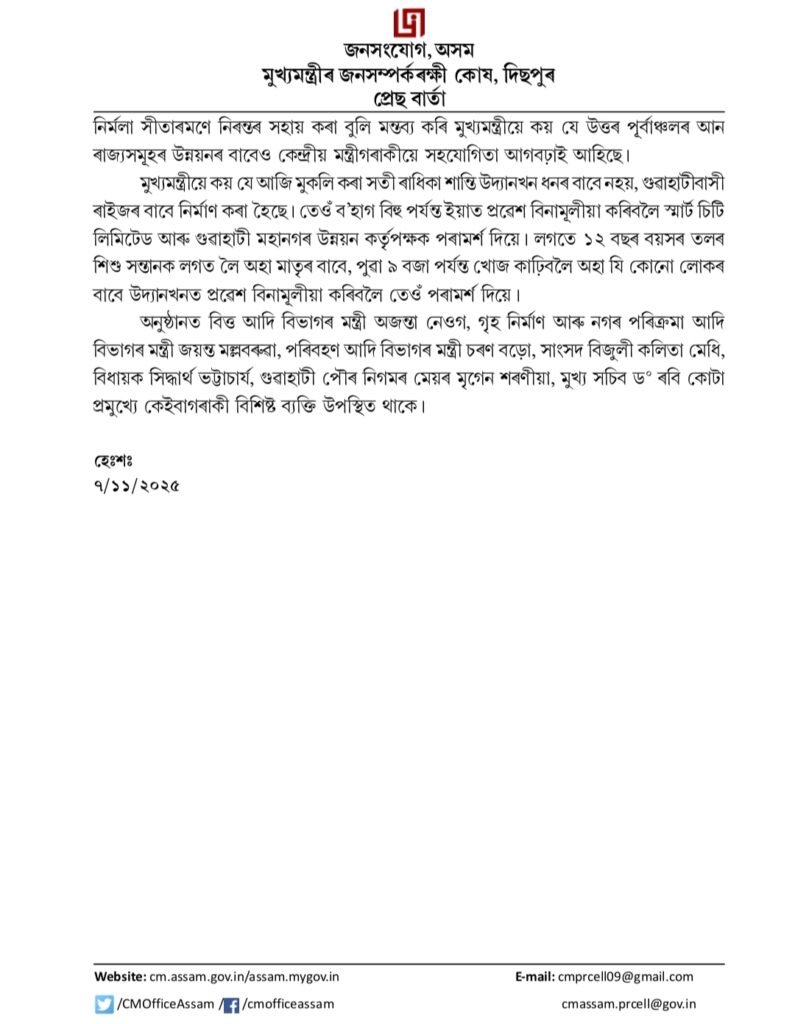 The Chief Minister emphasized that the newly inaugurated Sati Radhika Shanti Udyan has been developed not for profit but for the people of Guwahati.