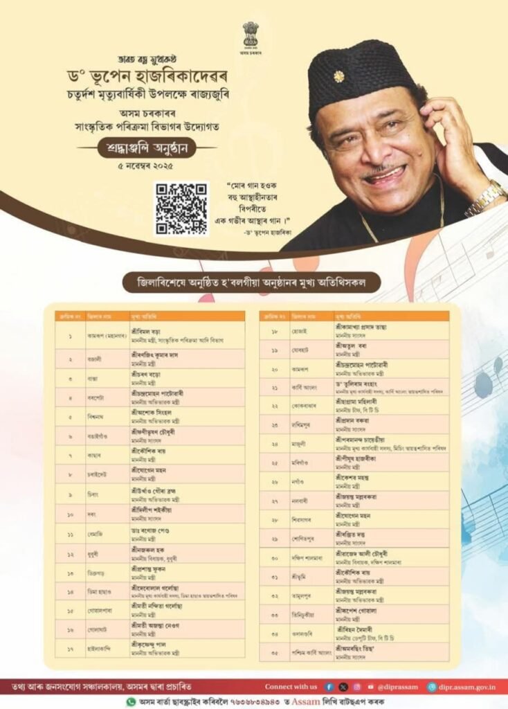 DD TIMES বঢ়মপুৰ, ৪ নৱেম্বৰঃ অসমীয়া সাহিত্য সন্মিলনীৰ নগাঁও জিলা সমিতিৰ উদ্যোগত অহা ৫ নৱেম্বৰৰ পুৱা ১০:৩০ বজাৰ পৰা নগাঁও চহৰৰ নেহৰু যুৱ কেন্দ্ৰৰ সভাকক্ষত বিশ্ববৰেণ্য সংগীতশিল্পী, সুধাকণ্ঠ ডঃ ভূপেন হাজৰিকা দেৱৰ মৃত্যু দিৱস উপলক্ষে বিশেষ স্মৃতিচাৰণ অনুষ্ঠানৰ আয়োজন কৰা হৈছে।