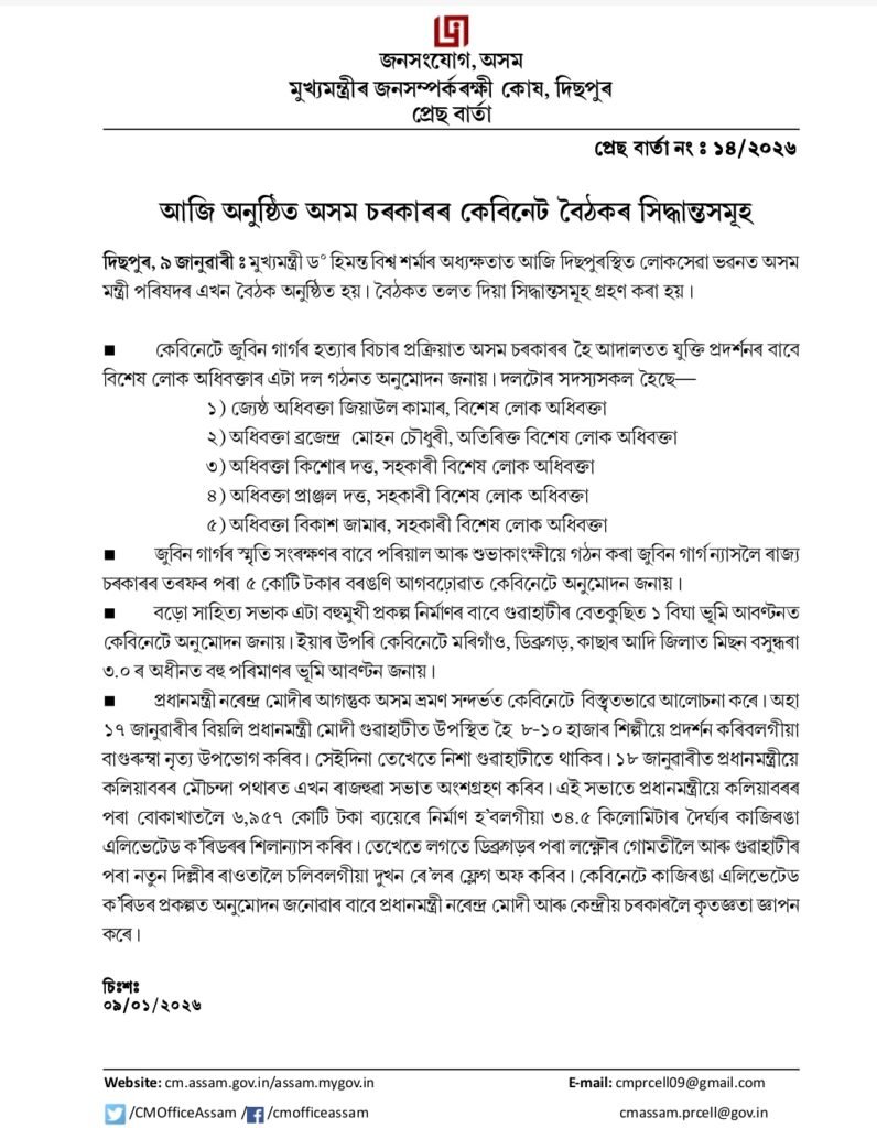 The State Cabinet has approved the appointment of a team of Special Public Prosecutors in the Zubeen Garg death case.