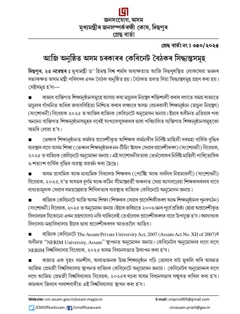 The State Cabinet has approved the Assam Non-Government Educational Institutions (Regulation of Fees) (Amendment) Bill, 2025, aimed at strengthening the regulation of fees charged by private educational institutions and ensuring that all non-government educational institutions, including those established and managed by minorities under Article 30(1) of the Constitution of India, are subject to transparent registration, fee fixation, and periodic renewal as mandated by law.