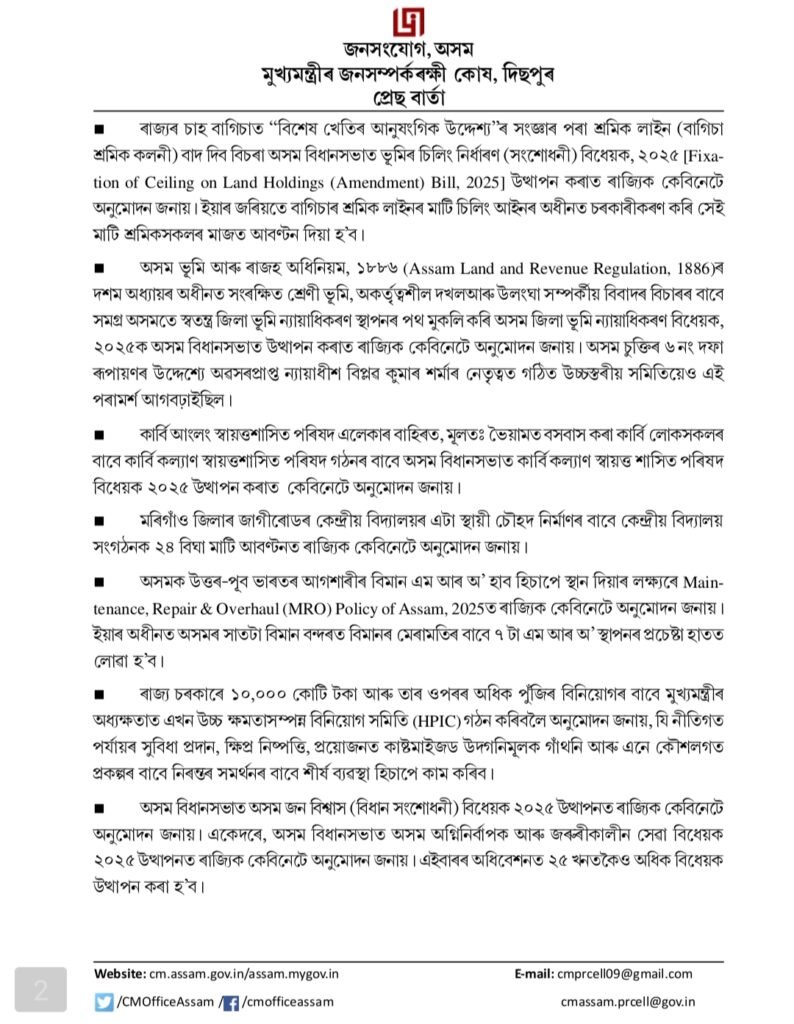 The State Cabinet has approved introduction of the Assam Fixation of Ceiling on Land Holdings (Amendment) Bill, 2025 before Assam Legislative Assembly, which seeks to exclude labour lines (garden labour colonies) from the definition of “purposes ancillary to special cultivation” in tea estates. This landmark amendment aims to ensure secure land rights for tea garden worker families by allowing the State to resume labour line land and settle it exclusively with verified worker households. As part of the reform each tea garden worker family residing in labour lines will be eligible for settlement. A total of 2,18,553 bighas of land across 825 tea estates and 3,33,486 tea worker families are expected to be benefitted under this historic piece of legislation.