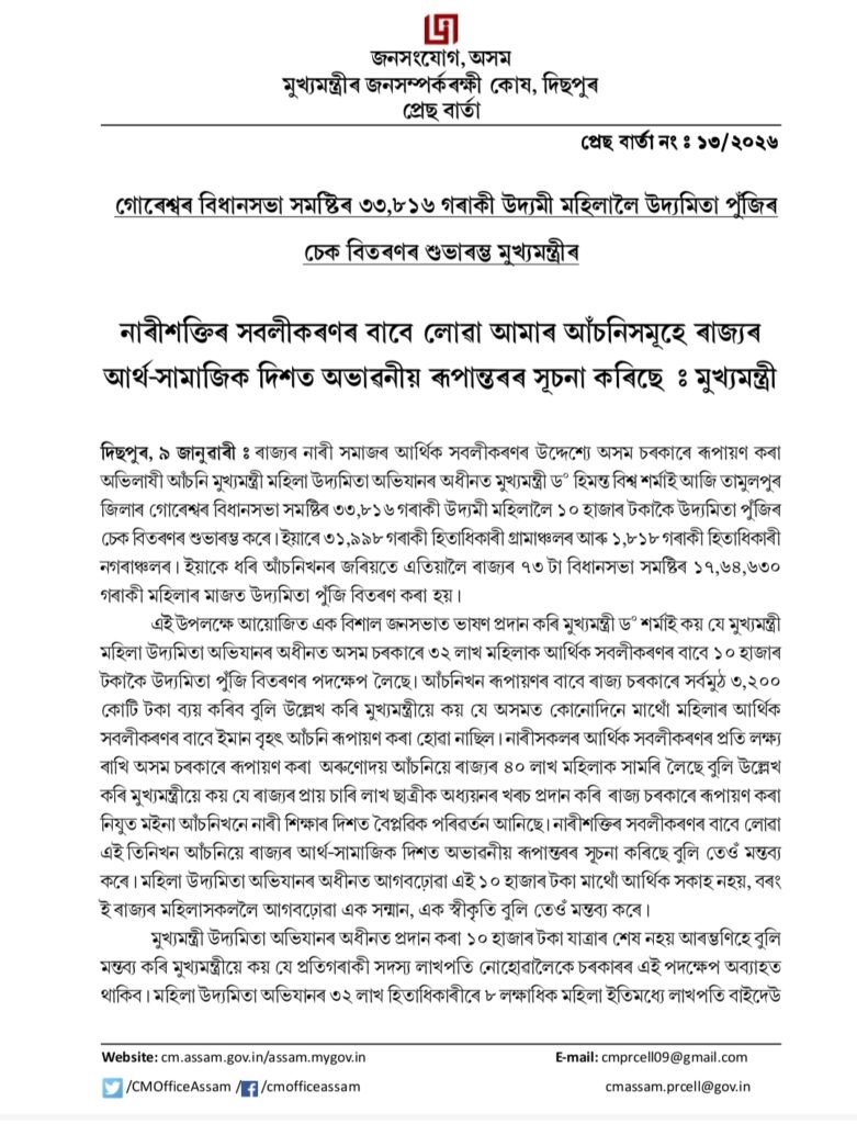 Speaking on the occasion, Chief Minister Dr. Sarma stated that under the Mukhya Mantri Mahila Udyamita Abhiyan, the Government has undertaken the initiative to provide entrepreneurship funds of Rs.10,000 each to 32 lakh women for their economic empowerment.