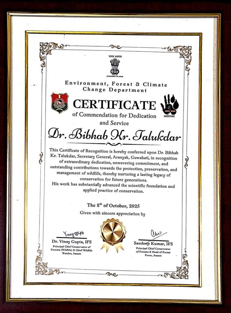 সংৰক্ষণ ক্ষেত্ৰলৈ উৎকৃষ্ট অৱদানৰ স্বীকৃতি, ড° বিভৱ কুমাৰ তালুকদাৰলৈ অসমৰ বন বিভাগৰ প্ৰশংসা পত্ৰ