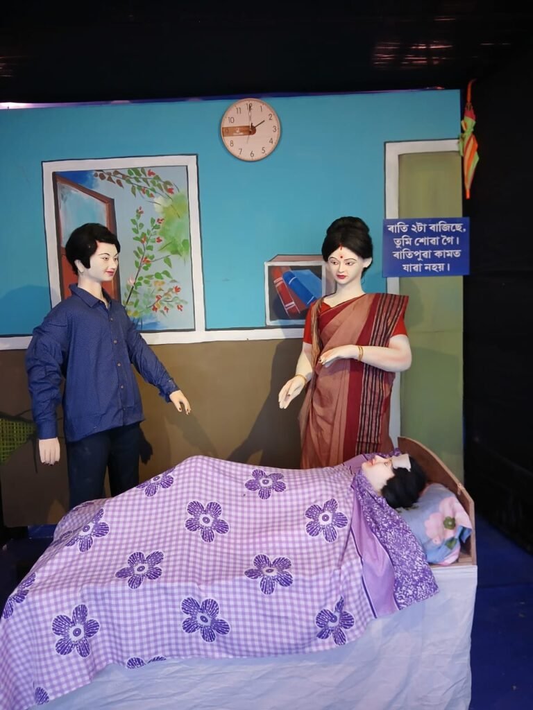 নগাঁও হিন্দু মিলন মন্দিৰ দুৰ্গোৎসৱ সমিতিৰ সভাপতি তথা বিশিষ্ট সমাজকৰ্মী প্ৰহ্লাদ চন্দ্ৰ বনিকে জানিবলৈ দি কয় যে সাম্প্ৰতিক সময়ত একাংশ কুলাংগাৰ সন্তানে নিজ পিতৃ মাতৃক অৱহেলিত কৰা নেতিবাচক ঘটনাৰ বিপৰীতে এজন সুযোগ্য সুপুত্ৰক এটি সন্তানে জন্ম লাভ কৰাৰ পিছৰ পৰা শিক্ষা গ্ৰহণ কৰি প্ৰতিষ্ঠিত হোৱালৈকে আৰু নিজে ঘৰ সংসাৰ পতাৰ পিছতো বৃদ্ধ পিতৃ মাতৃক যি পৰিচৰ্যা কৰে তাক উপজীব্য হিছাপে লৈ প্ৰতিমূৰ্তি আকাৰে সফল চিত্ৰায়ণ কৰিছে আৰু লগতে শিৱৰূপে মা দুৰ্গাৰ আৰাধনা কৰাৰ এক নতুন মাত্ৰা প্ৰদান কৰিছে৷