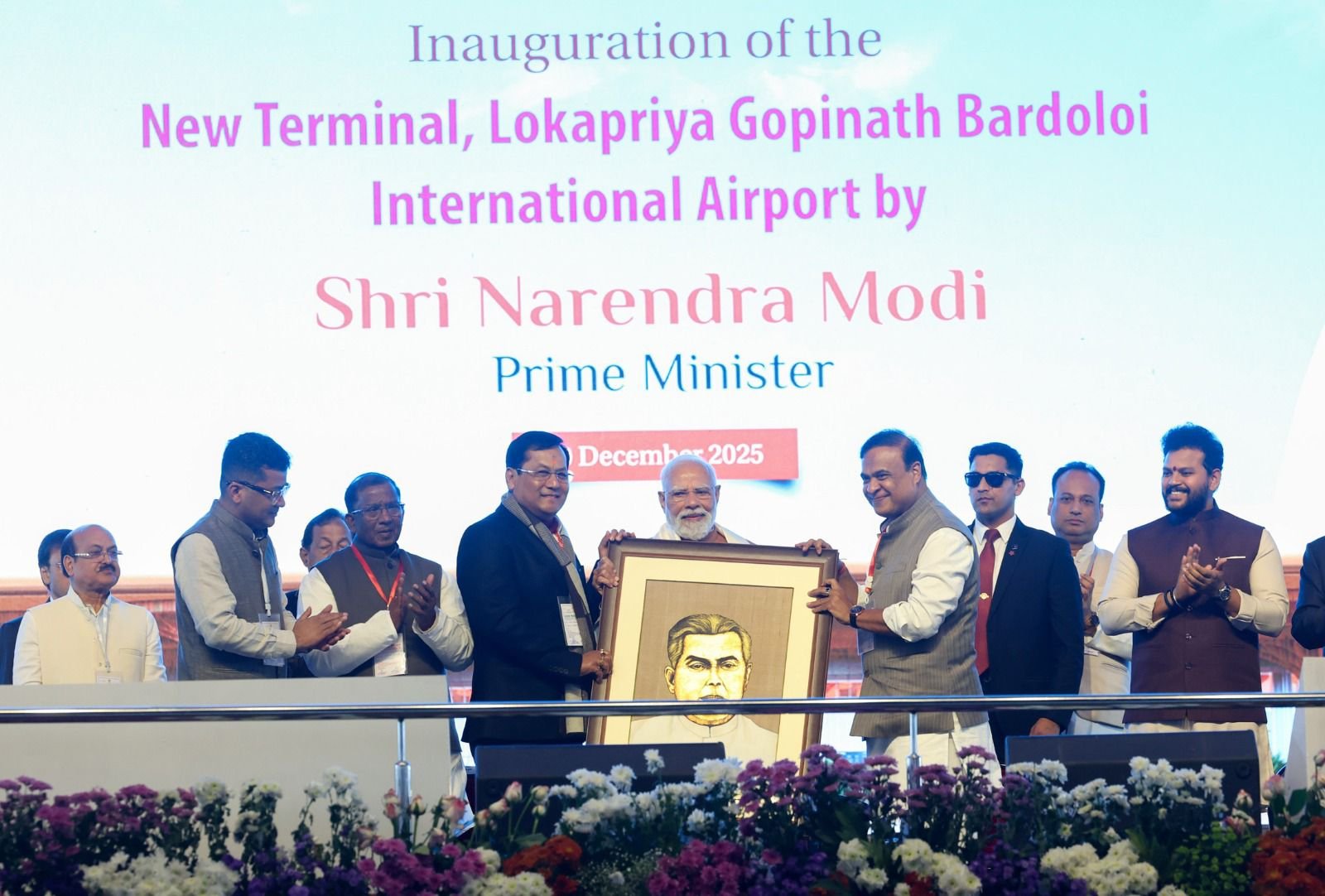 প্ৰধানমন্ত্ৰী নৰেন্দ্ৰ মোদীয়ে লোকপ্ৰিয় গোপীনাথ বৰদলৈ আন্তৰ্জাতিক বিমানবন্দৰৰ নতুন টাৰ্মিনেলৰ শুভ উদ্বোধন কৰাৰ সময়ত গণ্য-মান্য ব্যক্তিসকলৰ সৈতে সংগ দিয়ে কেন্দ্ৰীয় মন্ত্ৰী সৰ্বানন্দ সোণোৱালে