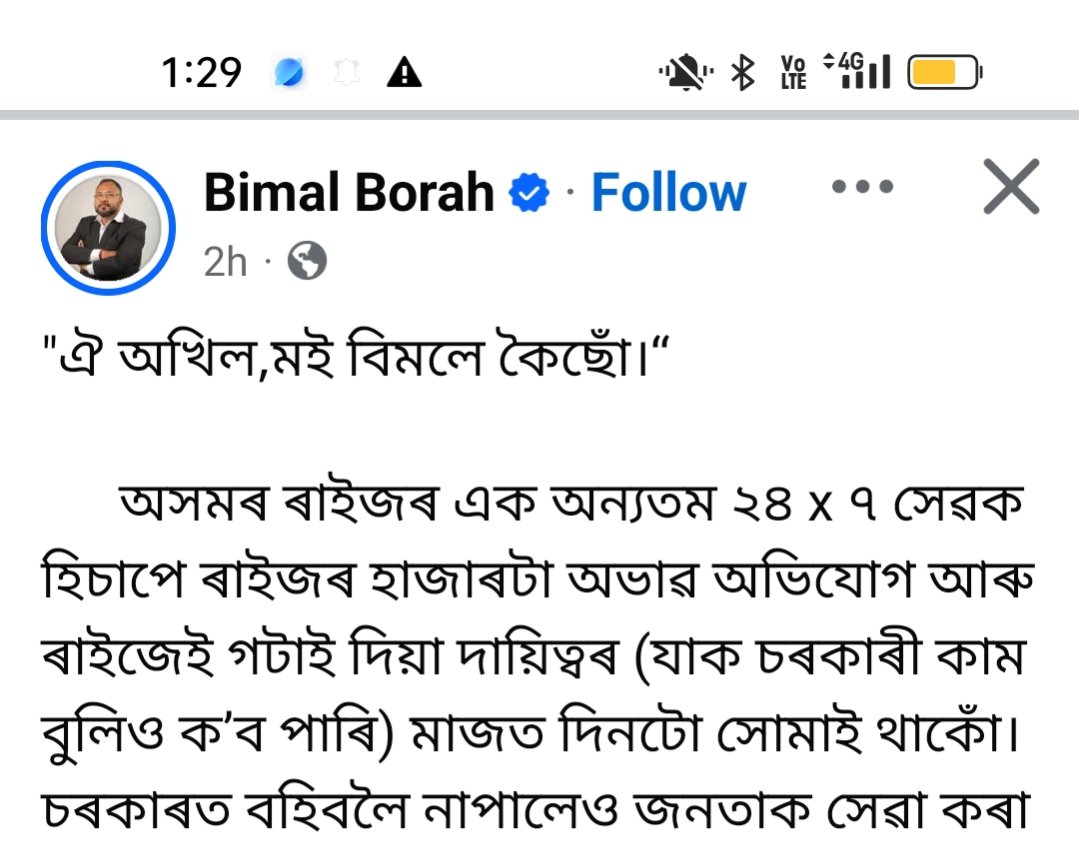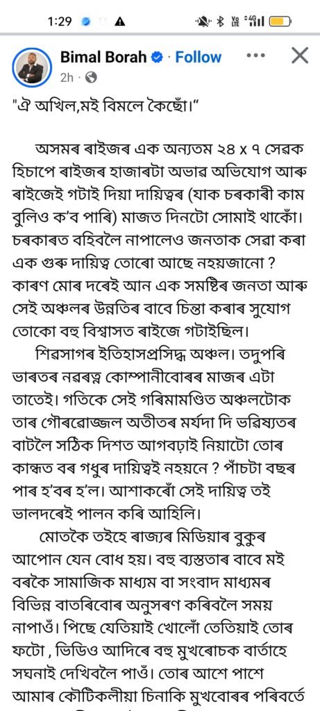 সহপাঠী তথা বিধায়ক অখিল গগৈলৈ মন্ত্ৰী বিমল বড়াৰ সামাজিক মাধ্যমযোগে দ্বিতীয়খন চিঠি