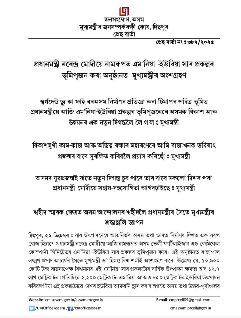 It will significantly reduce the country’s dependence on urea imports and play a crucial role in meeting the urea requirements of Assam and the North-Eastern region. The project will also create employment opportunities for local youth.