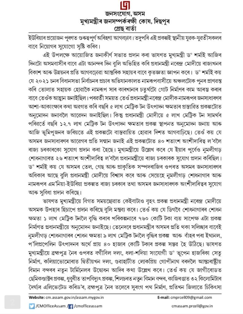 The Chief Minister further noted that Swargadeo Chaolung Siu-Ka-Pha had vowed to build Greater Assam on the sacred land of Tipam in Namrup, and today, on the very land, the Prime Minister has taken Assam to a new horizon of development through laying foundation stone of the Ammonia–Urea Project.