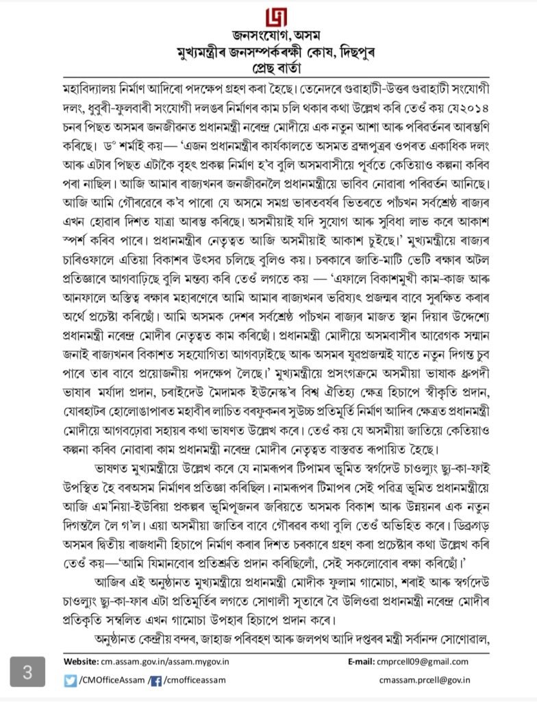 In this context, the Chief Minister also mentioned the Prime Minister’s support in granting classical language status to Assamese, securing UNESCO World Heritage recognition for the Charaideo Maidams, and the construction of a grand statue of Vir Lachit Borphukan at Hollongapar in Jorhat. He said that under Prime Minister Narendra Modi’s leadership, achievements once unimaginable for the Assamese community have become reality.