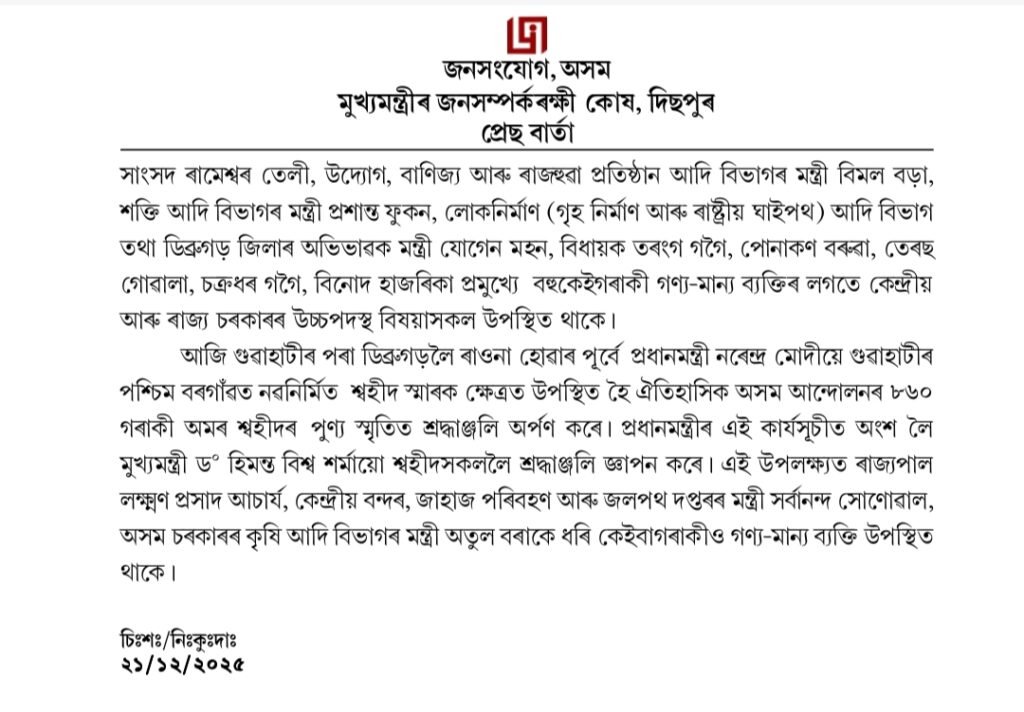 Chief Minister Dr. Himanta Biswa Sarma also paid tribute to the martyrs while accompanying the Prime Minister. On the occasion, Governor Lakshman Prasad Acharya, Union Minister Sarbananda Sonowal, Minister for Agriculture Atul Bora, and several other dignitaries were present.
