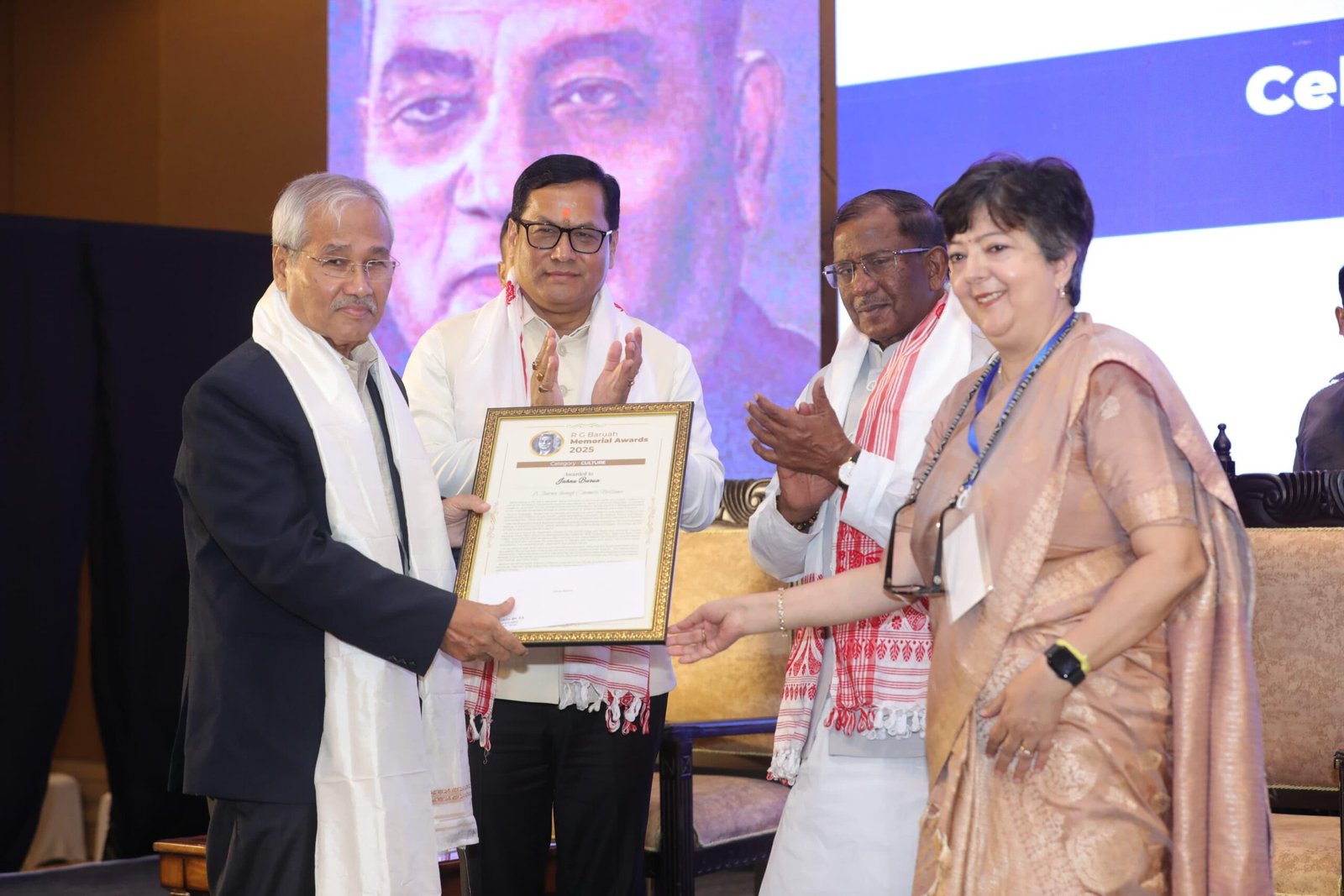 DD TIMES গুৱাহাটী, ১০ নৱেম্বৰ ২০২৫ঃ “দ্য আছাম ট্ৰিবিউন ডায়লগ ২০২৫ আৰু আৰ জি বৰুৱা মেম’ৰিয়েল এৱাৰ্ড ২০২৫” অনুষ্ঠানত ৰাজ্যপাল লক্ষ্মণপ্ৰসাদ আচাৰ্য, দ্য আছাম ট্ৰিবিউনৰ পৰিচালন সঞ্চালক ববিতা ৰাজখোৱাৰ সৈতে কেন্দ্ৰীয় মন্ত্ৰী সৰ্বানন্দ সোণোৱালে অংশগ্ৰহণ কৰে আৰু সাংবাদিকতা, সংস্কৃতি, উদ্যমিতা আৰু ক্ৰীড়া ক্ষেত্ৰত পাৰদৰ্শিতা দেখুওৱা গণ্য-মান্য ব্যক্তিক আৰ জি বৰুৱা মেম’ৰিয়েল এৱাৰ্ড ২০২৫ প্ৰদান কৰে।
