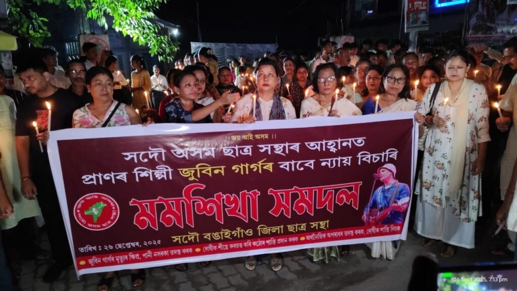 প্ৰাণৰ শিল্পী জুবিন গাৰ্গৰ মৃত্যুৰ ঘটনাৰ ন্যায় বিচাৰি শুকুৰবাৰে সন্ধিয়া বঙাইগাঁও চহৰত আছুৰ আহ্বানত এক মমশিখা সমদল কাৰ্যসূচী ৰূপায়িত হয় ৷ সদৌ বঙাইগাঁও জিলা ছাত্ৰ সন্থাৰ উদ্যোগত সংগঠনটোৰ জিলা কাৰ্যালয় শ্বহীদ ভৱনৰ পৰা চহৰখনত উলিওৱা এই মমশিখা সমদলত বিভিন্ন ভাষা- ভাষী, দল – সংগঠনৰ লগতে ভিন্নস্তৰৰ লোকে অংশ গ্ৰহণ কৰে ৷