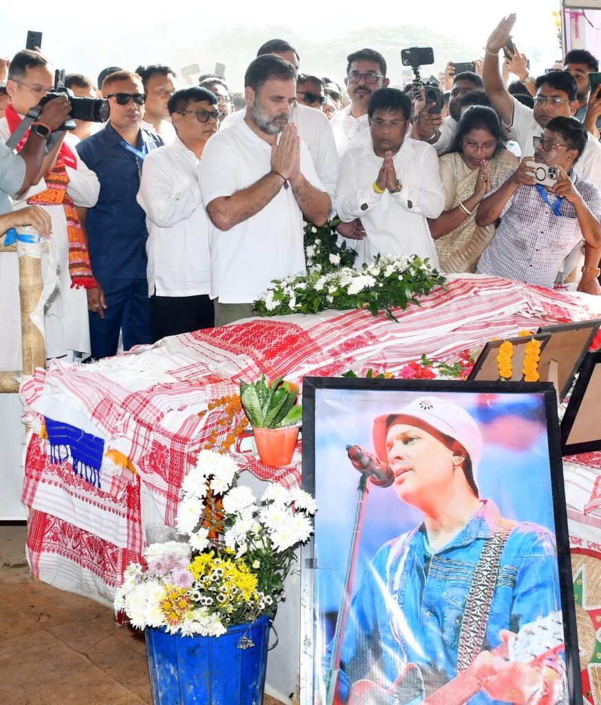 DD TIMES Guwahati, October 17: Leader of the Opposition in the Lok Sabha, Rahul Gandhi, arrived in Guwahati today to pay tribute to Assam’s beloved music icon Zubeen Garg. Soon after his arrival, he visited the artist’s resting place at Sonapur, near the city, where he offered floral and candle tributes. Later, Gandhi visited the late artist’s residence at Kahilipara, where he met Zubeen’s wife Garima Saikia Garg and father Kapil Thakur, expressing his heartfelt condolences.